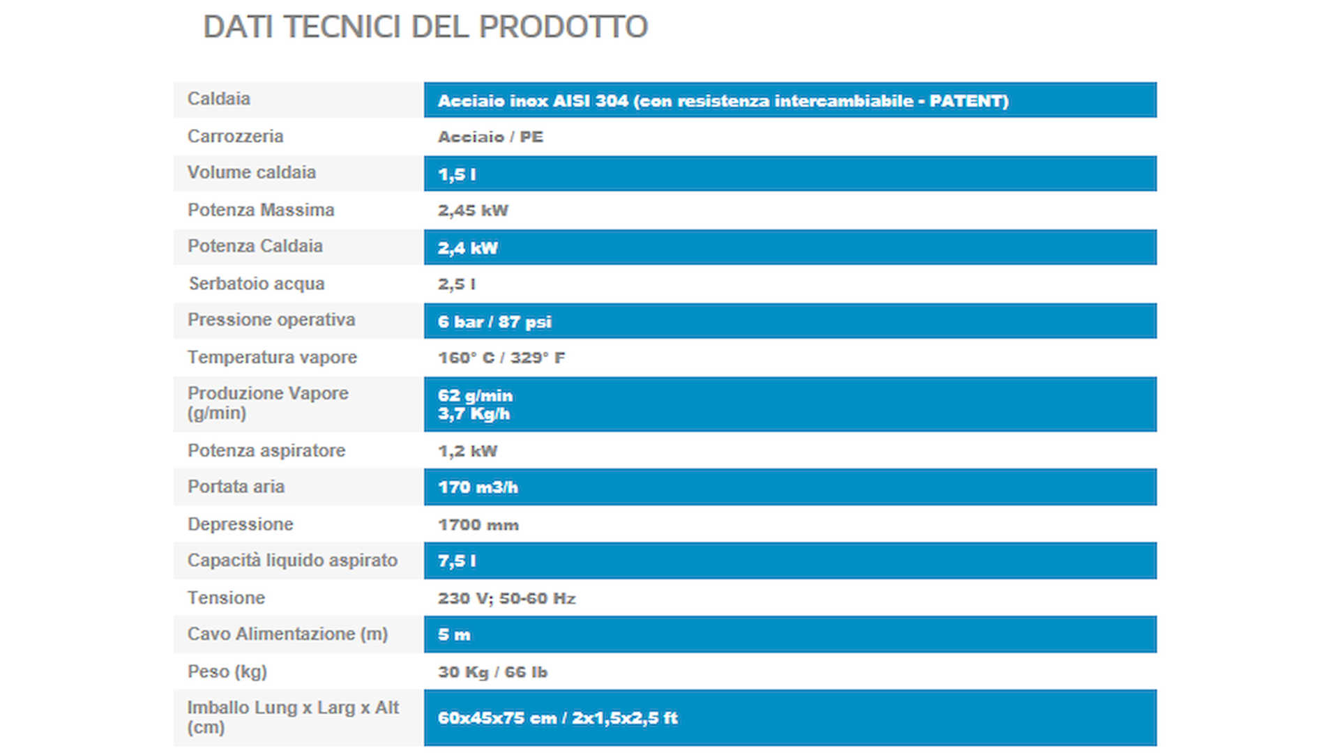 GENERATORE DI VAPORE MONOFASE con sistema di ricarica automatica con controllo elettromeccanico livello acqua in caldaia – True Temp, Aspirapolvere/aspiraliquidi con sistema di filtraggio ad acqua e separatore. Iniezione acqua surriscaldata.
