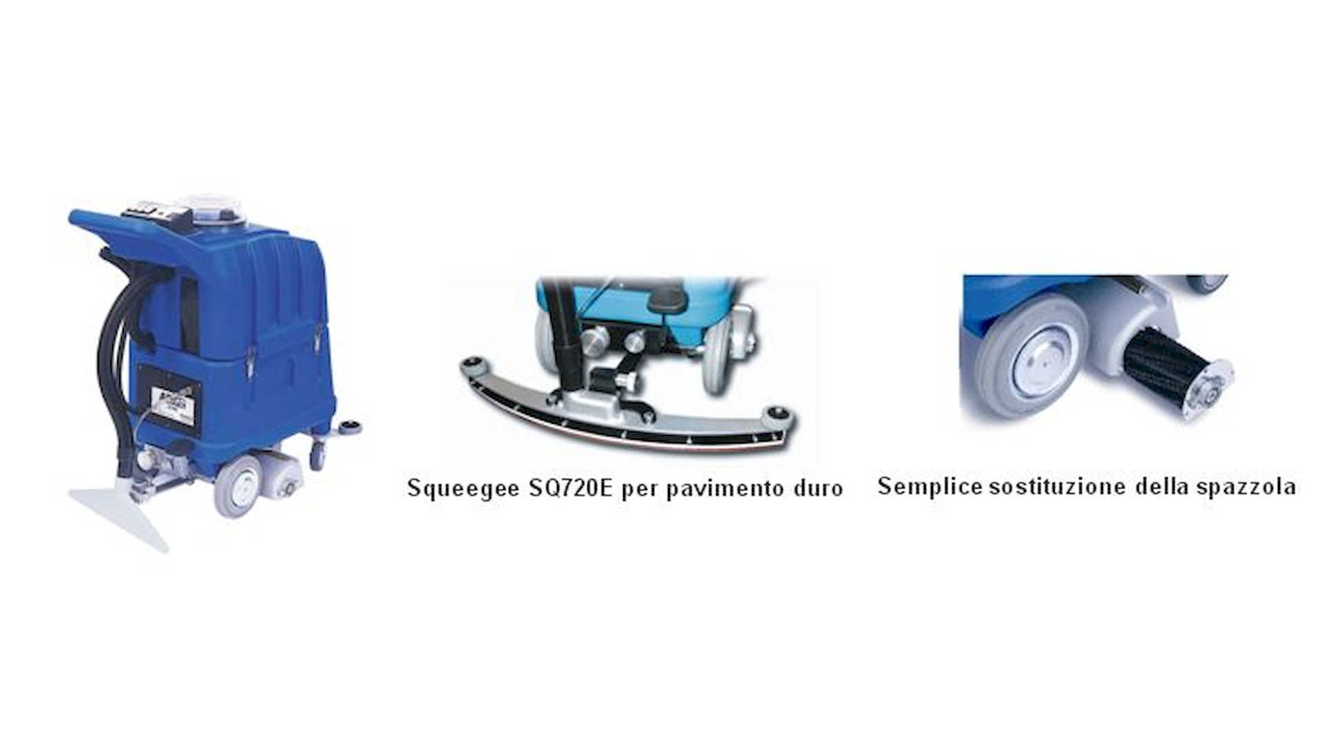 Possibilità di pulire superfici di moquette e di pavimento con un’unica macchina, con l’utilizzo dello squeegee opzionale SQ720E. L’aggancio avviene con un innesto rapido, senza richiedere l’uso di attrezzi.