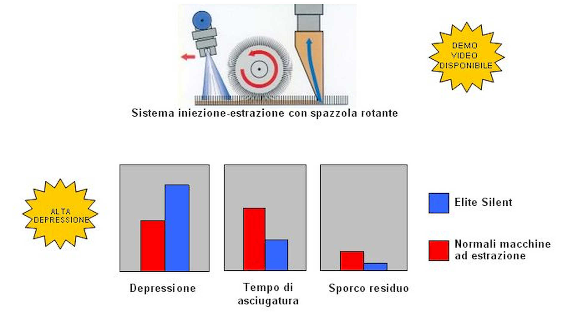 Elite-Silentè una lavamoquette-lavapavimenti compatta, a trazione manuale. Lava, spazzola ed asciuga una striscia di 50 cm di moquette, camminando in avanti e pulendo fino a 500mq di moquette in un’ora. Il sistema di aspirazione ad alta depressione consente di rimuovere la massima quantità di sporco dalla moquette e di ottenere un tempo di asciugatura molto breve.